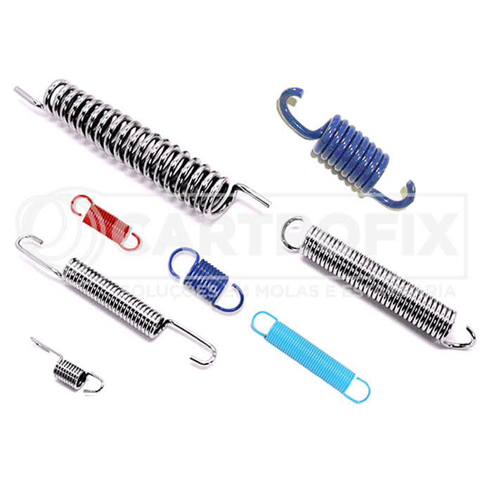Fabricamos molas de tração com espiras juntas ou separadas sem restrições de desenvolvimentos (comprimento livre), com diâmetros de arame de até 4,00 mm em aço de diversas ligas, em diferentes formas mediante desenho técnico, especificações ou amostra.