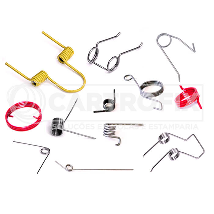 Fabricamos molas de torção com espiras juntas ou separadas de diversos formatos de hastes com diâmetros de arame até 4,00 mm em aço de diversas ligas, mediante desenho técnico, especificações ou amostra.